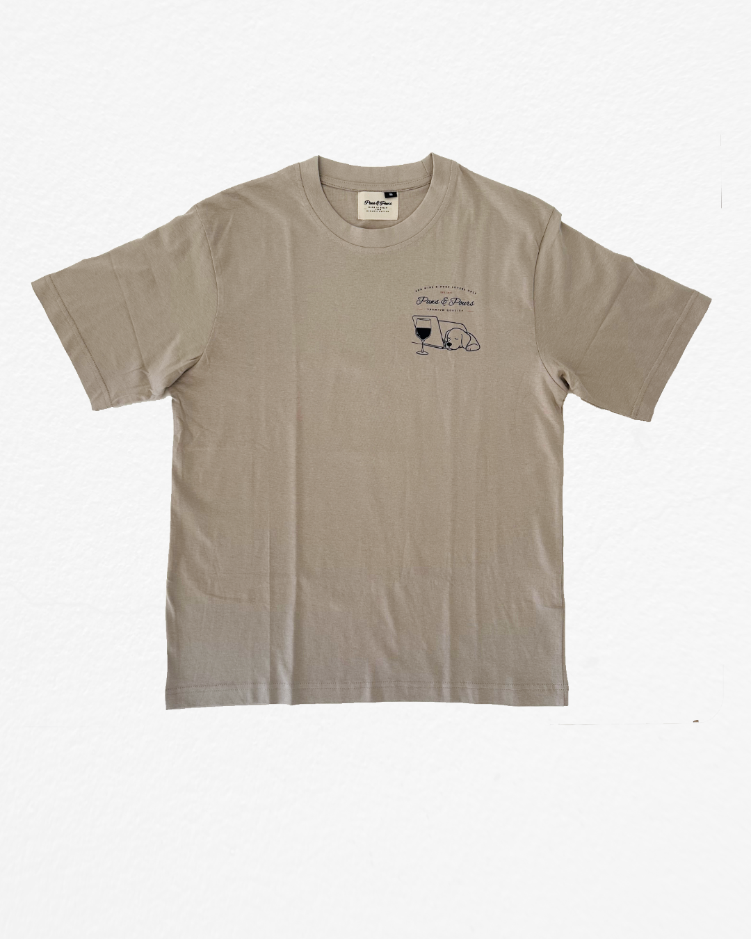 Camiseta oversize unisex disponible en tres tallas, color único taupe beige, hecha de algodón orgánico con una imagen estampada de un perro cachorro dormido, una copa de vino y un ordenador, con el logo de la marca por encima