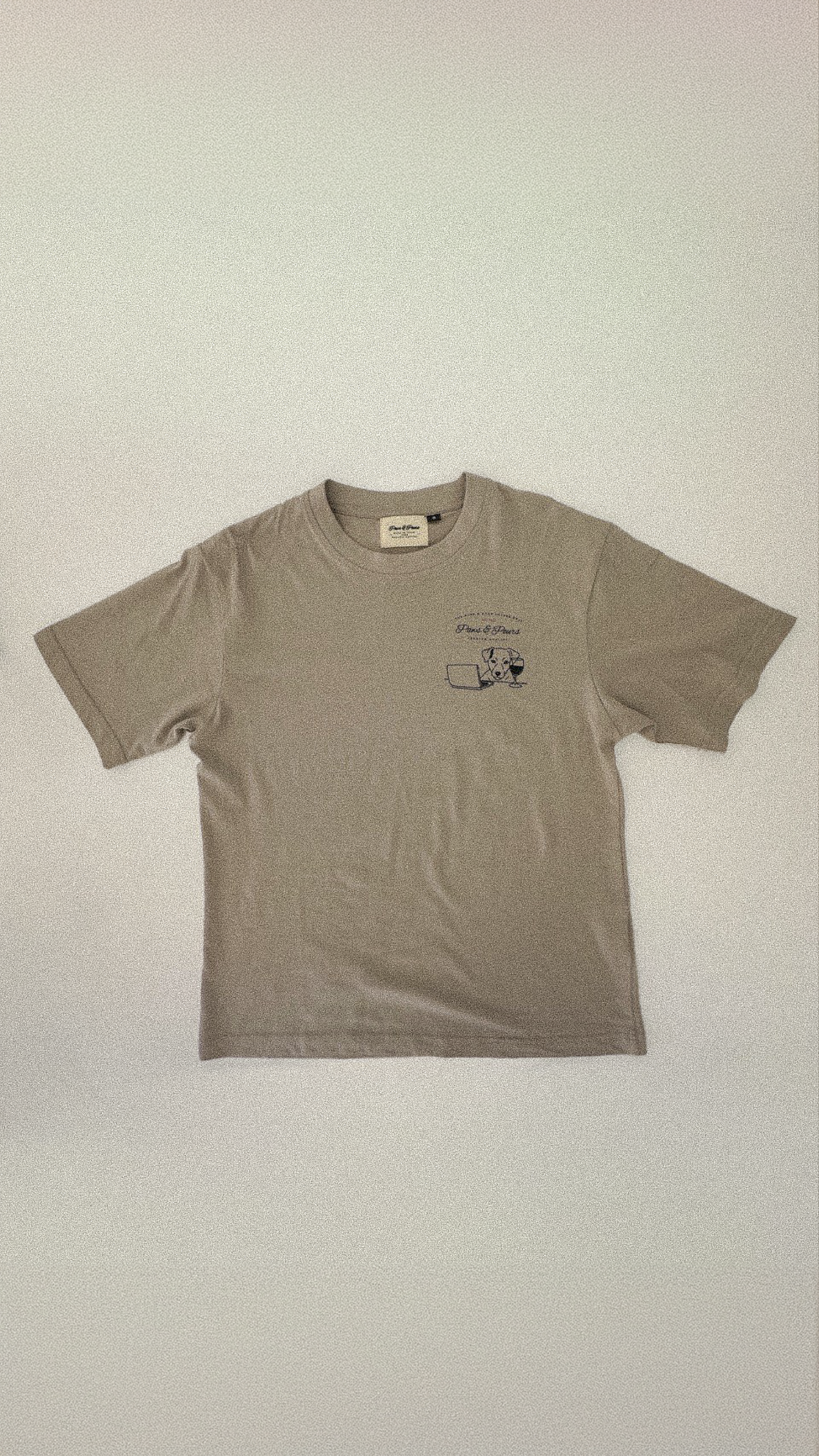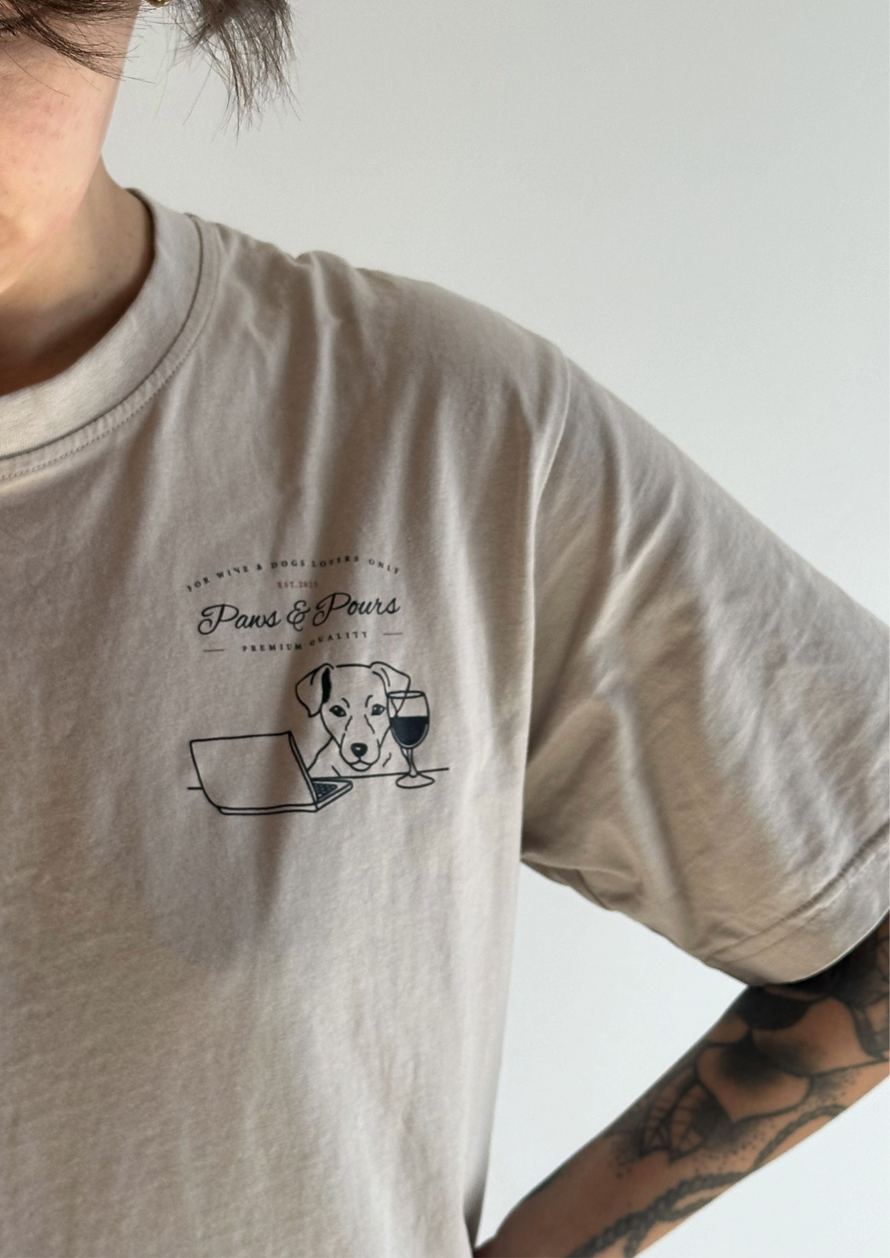 Camiseta oversize unisex disponible en tres talla, color único taupe beige, hecha de algodón orgánico con la imagen estampada de un perro de la raza Jack Russell Terrier y una copa de vino y un ordenador, con el logo de la marcador encima